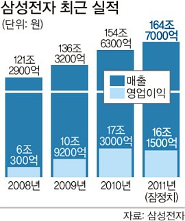 삼성전자의 지난해 연간 매출액은 사상 최대이던 2010년(154조6300억원)보다 10조원 이상 늘어난 164조7000억원을 기록했다. 연간 영업이익은 16조1500억원으로 2010년(17조3000억원)에 이어 두 번째로 많았다. 삼성전자는 이로써 2010년에 이어 2년 연속 ‘매출 150조원·영업이익 15조원’을 돌파했다.