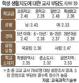 한국교총연구소는 지난해 8월 한 달간 초·중·고교 교사 7842명을 상대로 근무여건 등에 관한 설문조사를 벌인 결과 ‘생활지도에 대한 부담 인식도’는 평균 2.38점이었다고 10일 밝혔다. 인식도 점수는 ‘매우 그렇다’를 1점, ‘보통이다’를 3점, ‘전혀 그렇지 않다’를 5점으로 한 것으로, 2.38점은 교사들이 대체로 학생지도에 부담을 갖고 있다는 것을 의미한다.