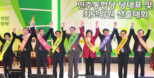 | 한명숙 후보(맨 왼쪽) 등 민주통합당 새 대표 후보들이 15일 경기 고양시 킨텍스에서 열린 전당대회에서 손을 맞잡고 대의원들에게 인사하고 있다. 김준범 기자 |