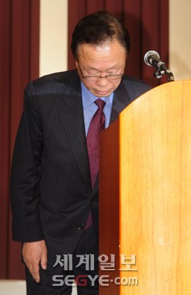 | 박희태 국회의장이 18일 오전 인천국제공항을 통해 귀국, 돈봉투 사건과 관련한 기자회견을 마친 뒤 고개 숙여 인사하고 있다. 인천공항=김범준 기자 |