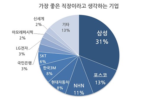 한국 기업 중 직장인과 대학생 모두에게 가장 좋은 직장으로 ‘삼성전자’(31%)가 뽑혔다. 한 모바일 설문조사 업체가 직장인과 대학생 500명을 대상으로 설문조사를 실시한 결과 이와 같이 나타났다. 이어 △포스코(13.2%) △NHN(11.2%) △현대자동차(8.2%) 등의 순으로 드러났다.