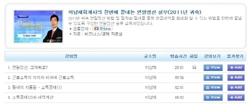 강의는 연말정산의 개요, 근로소득의 의의와 비과세 근로소득, 소득공제, 세액계산 등 총 4개 강좌로 구성되었다. 부모나 배우자, 자녀, 형제 자매 등 인적 공제에 관한 내용과 특별공제, 개인연금저축, 신용카드사용액 등 다양한 소득공제 정보를 제공해 주어 연말정산에 필요한 노하우들을 얻을 수 있다.