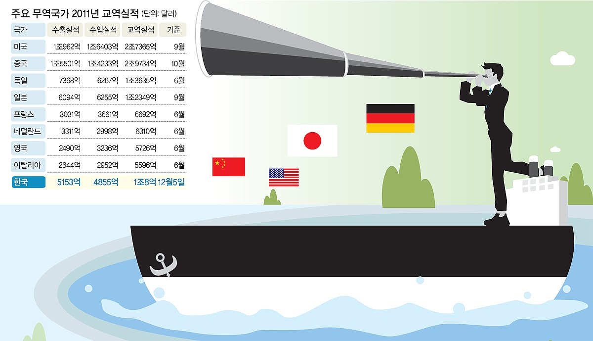 이처럼 괘속 항진해왔지만 2조달러 시대는 만만치 않을 것 같다. ‘G2’로 부상한 미국과 중국은 1조달러 클럽에 가입한 이후에도 주력 산업의 발 빠른 변화를 시도하며 2조달러, 3조달러로 순항했다. 이에 반해 이탈리아, 영국, 네덜란드 등은 글로벌 금융위기 여파로 2009년 무역규모가 1조달러 아래로 다시 추락하는 수모를 겪기도 했다.