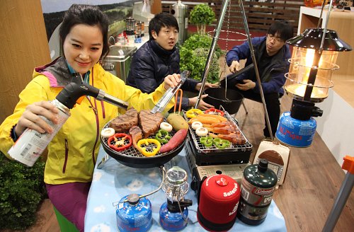 27일 서울 강남구 대치동 서울무역전시장에서 열린 ‘제 8회 서울국제가스산업전(GAS KOREA 2012)’에서 모델들이 온실가스 배출이 적은 친환경 LPG 캠핑용품을 선보이고 있다.