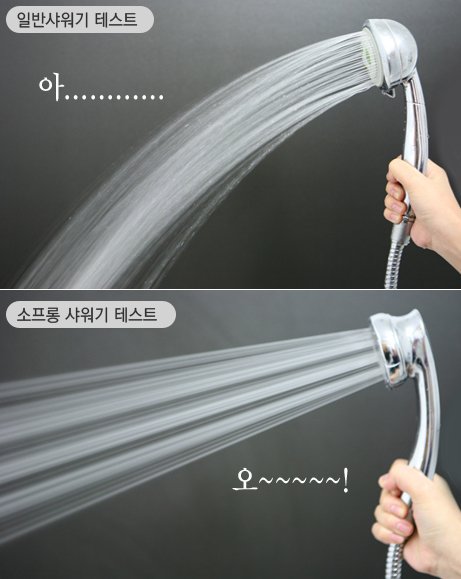 이럴 때 샤워기 헤드를 교체하면 간단히 해결된다는 사실을 아는 이들이 몇이나 될까? 절수 샤워기 ‘소프롱(Softrong)’ 샤워기는 물은 오히려 적게 쓰면서 수압은 높이는 일거양득의 기능성제품이다. 수도세는 최고 60% 줄고, 수압은 최고 250% 상승한다.