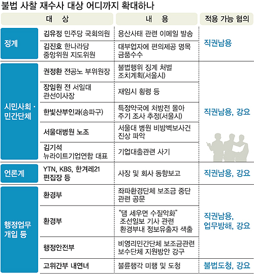 정치인들과 언론, 시민사회단체에 대한 사찰도 재수사 대상으로 거론된다. 또 사찰 대상이 공무원이더라도 사퇴 압박용으로 이뤄졌다면 강요나 협박 혐의 적용도 가능하다는 게 법조계 판단이다.
