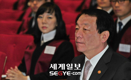 | 민간인 불법사찰 파문과 관련, 야당으로부터 퇴진 압박을 받고 있는 권재진 법무장관이 2일 정부과천청사에서 열린 신임 검사 임관식에 참석해 행사를 지켜보고 있다. 김준범 기자 |