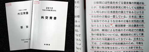 | 일본 정부가 독도 영유권을 주장하는 내용을 담은 ‘2012 외교청서’를 6일 공개했다. 외교청서 표지(왼쪽)와 ‘지역별로 본 외교’ 한국편의 독도 영유권 주장 부분. 도쿄=연합뉴스 |