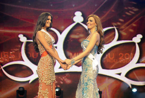 도미니카공화국 수도 산토도밍고에서 지난 17일 열린 미인선발대회에서 1위를 차지한 칼리나 두란(왼쪽)과 2위를 차지한 둘시타 리에기가 함께 서 있다. 두란이 2009년 결혼한 사실이 발각돼 왕관을 박탈당하면서 리에기가 미스 도미니카로 미국에서 열리는 미스 유니버스 대회에 출전하게 됐다. 이 대회 이사인 마가리 페블레스는 기혼자나 이혼한 사람은 참가할 수 없다고 밝혔다.