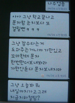 | 지난달 24일 살인 피의자 이군이 피해자 김씨에게 보낸 문자. 김씨가 이군의 여자친구 홍양에게 “헤어지라”는 문자메시지를 보낸 것에 대한 불만을 표현한 내용이 담겨 있다. |