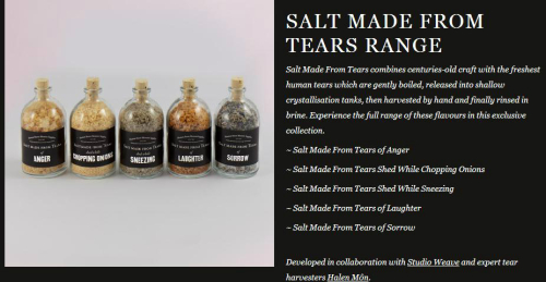 영국 런던의 ‘헉스턴 스트리트 몬스터’란 업체가 인터넷 쇼핑몰(www.monstersupplies.org)을 통해 사람의 눈물로 만든 소금을 판매하고 있다고 영국 IT매체 ‘기즈모도(GIZMODO)’ 영국판이 25일(현지시간) 보도했다.