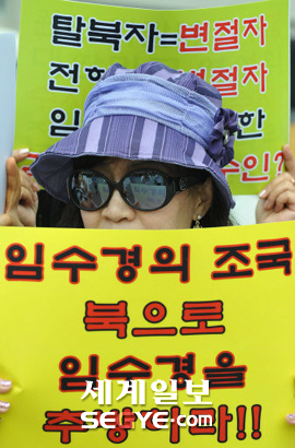‘바른사회여성모임’ 소속 회원이 7일 서울 영등포구 민주통합당 당사 앞에서 임수경 의원의 탈북자 매도 발언을 규탄하는 피켓 시위를 벌이고 있다.