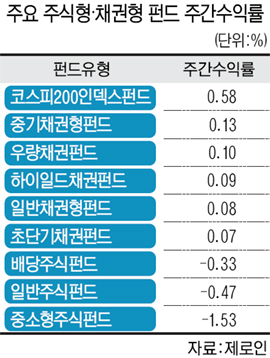 이에 반해 국내주식형 펀드는 -0.23%의 수익률에 그쳤다. 코스피가 0.24% 상승했음에도 대부분의 주식형 펀드가 마이너스 수익률을 보였다. 배당주식펀드 및 일반주식펀드는 -0.33%, -0.47%의 하락률을 기록했고, 중소형주식 펀드가 -1.53%의 수익률로 가장 낮은 성과를 나타냈다. 다만 주 후반에 기관의 매수세로 대형주 편입이 많은 코스피200인덱스펀드는 0.58%의 높은 주간수익률을 기록했다.
