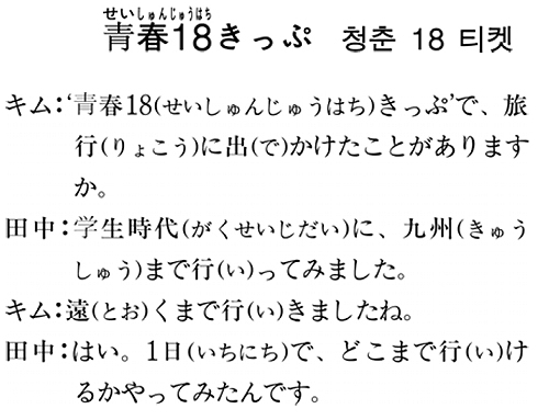 방학이 가까워지면 ‘청춘 18 티켓’이라는 기한 한정의 기차표가 나온다. 5장 1묶음이 1만1500엔에 판매되고, 한 장으로 일본 전국의 JR철도를 하루 종일 마음대로 탈 수 있다. 다만 신칸센이나 특급열차는 제외된다.