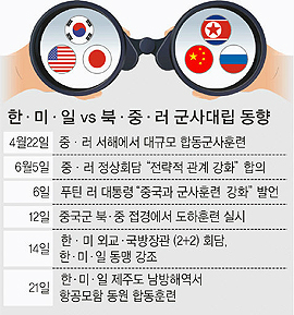 미국이 태평양 군사력을 강화하면서 북·중·러의 움직임도 바빠졌다. 중국과 러시아는 지난 5일 베이징에서 정상회담을 갖고 군사협력을 포함한 전략적 협력관계 강화를 선언했다. 블라디미르 푸틴 러시아 대통령은 “중국과의 군사훈련을 강화하겠다”고도 했다. 지난 4월에는 러시아 함대가 서해로 와 중·러 연합훈련을 실시했다.