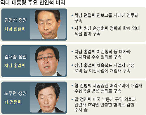 군사정권을 마감하고 문민정부를 열며 자신감에 넘쳤던 김영삼 전 대통령은 재임 중 아들이 구속되는 불명예를 기록했다. 정권실세였던 차남 현철씨가 기업인 6명으로부터 66억원을 받고 증여세를 포탈한 혐의로 처벌됐다. 김대중 전 대통령은 ‘홍삼 트리오’로 불린 아들 셋이 각종 게이트에 연루되면서 곤욕을 치렀다. 특히 둘째 홍업씨와 셋째 홍걸씨는 각종 이권청탁과 정치자금 등의 명목으로 수십억원을 챙긴 혐의로 수의를 입었다.
