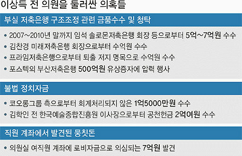 검찰은 미래저축은행의 정관계 로비 의혹도 조사한 것으로 알려졌다. 임 회장이 김찬경(56·구속기소) 미래저축은행 회장으로부터 구명로비 청탁과 함께 받은 억대의 금품이 이 전 의원에게 흘러간 것으로 검찰은 보고 있다. 검찰은 2009년 9월부터 지난해 11월까지 이 전 의원실의 여직원 임모(44·여)씨 개인 계좌에 입금된 출처불명의 뭉칫돈 7억여원과 저축은행 로비와의 관련성도 집중 추궁했다. 코오롱그룹이 이 전 의원실에 수년간 자문료 명목으로 건넨 1억5000만원의 불법성 여부도 수사 대상이다.