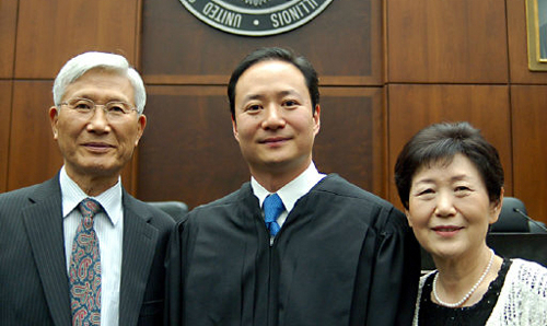 | 취임식장의 존 리 판사(가운데)와 부모. |