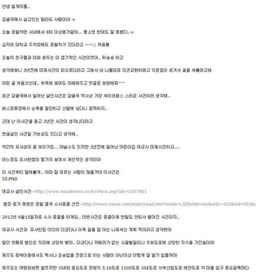 27일 몇몇 언론 매체들은 강씨가 지난 21일 오후 7시32분 한 인터넷 사이트에 ‘대망생이’란 아이디로 가입한 후 범행 추리 글(사진)을 게재했다고 보도했다.