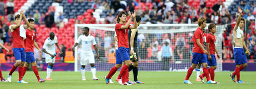 | 이제 8강전… 올림픽축구 대표팀 선수들이 1일(현지시간) 영국 런던의 웸블리 스타디움에서 열린 남자축구 B조 가봉과의 3차전에서 비겨 8강행을 확정한 뒤 박수로 자축하며 그라운드를 나서고 있다. 런던=연합뉴스 |