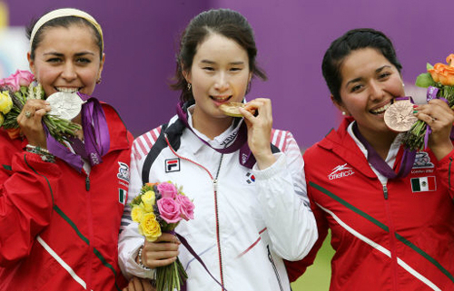 | 이맛이야 기보배가 2일(현지시간) 런던 로즈 크리켓 그라운드에서 열린 2012 런던올림픽 양궁 여자 개인전에서 금메달을 차지한 뒤 금메달을 깨물어 보이는 세리머니를 연출하고 있다. 런던=올림픽 사진공동취재단 |