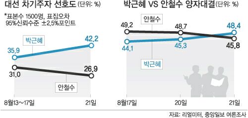 여론조사회사 리얼미터와 중앙일보가 20∼21일 자동응답 전화조사를 해 22일 공개한 결과에 따르면 박 후보는 양자 가상대결에서 48.4%의 지지율을 얻어 45.8%를 기록한 잠재 유력경쟁자 서울대 안철수 융합과학기술대학원장을 오차범위 내에서 앞섰다. 이 조사에서 박 후보가 안 원장을 꺾은 것은 13일 이후 처음이다.