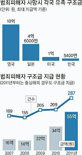 26일 법무부에 따르면 지난해 범죄피해자들에게 지원된 구조금은 55억1000여만원으로 5년 전인 2007년 16억여원에 비해 3배 이상 늘었다. 지급건수 역시 지난해 287건으로 5년 전 169건보다 증가했다. 그러나 이는 매년 25만여건에 달하는 살인·강도·강간·폭행·상해 등 강력범죄 발생 수치에 견줘 극히 미미한 비중이다.