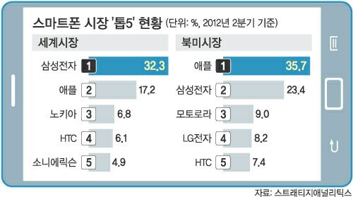 2분기 세계 스마트폰 시장점유율은 삼성전자가 32.2%로 1위, 애플이 17.2%로 2위를 차지했다. 시장점유율이 두 자릿수인 스마트폰 생산업체는 삼성전자와 애플뿐이다.