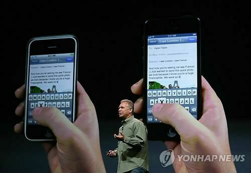 실러 부사장은 3.5인치 화면인 아이폰3GS 제품과 아이폰5에서 오른손 엄지손가락으로 쿼티(Qwerty) 자판의 왼쪽 끝에 있는 'x' 키를 누르는 화면을 크게 띄웠다.