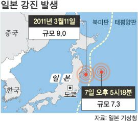 지난해 3월 11일 동일본대지진 발생 지역인 도호쿠(東北) 지방 앞바다(태평양)에서 7일 오후 5시18분쯤 규모 7.3의 강진이 발생했다. 진원은 북위 37.8도, 동경 144.2도이고 깊이는 10㎞로, 동일본대지진이 일어난 진원 부근으로 추정됐다. 일본 기상청은 “동일본대지진의 여진으로 추정된다”고 밝혔다.