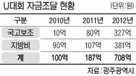 U대회의 재정 규모는 경기장 신축 등 시설비 4683억원과 대회 경기운영 등 운영비 3488억원 등 모두 8171억원에 이른다. 재원 조달은 2010년부터 2016년까지 7년간 국고 31.9%(2609억원)와 시비 53%(4330억원)를 각각 지원 받고 나머지 15.1%(1232억원)는 자체 수입으로 충당하도록 특별법에 명시돼 있다. 이 특별법에 따라 광주시는 2010년 90억원에 이어 지난해 107억원, 올해 381억원 등 모두 578억원을 출연금으로 냈다. 정부는 이 기간 동안 417억원을 국고 보조했다.
