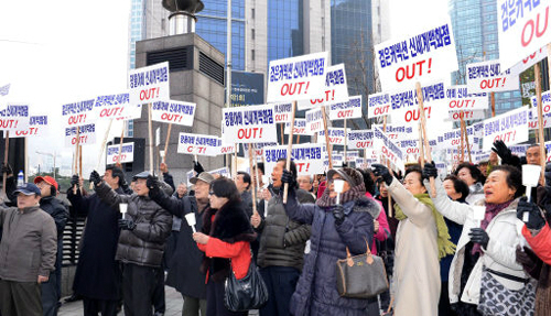 신도들 신세계본사 앞 항의 집회 통일교 신도대책위원회(상임대표회장 양준수)는 16일 서울 중구 충무로1가 신세계백화점 본사 앞에서 신도 300여명이 참여한 가운데 센트럴시티 매각에 대한 항의 집회를 열었다.