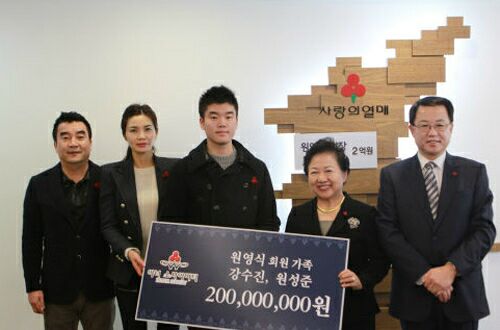 18일 사회복지공동모금회에 따르면 원영식(51) 오션인더블유 회장의 부인 강수진(41)씨와 아들 성준(16)군이 이날 각각 1억원 기부를 약정하면서 193번째, 194번째 아너 소사이어티 회원으로 가입했다. 원 회장이 2007년 8월부터 매달 1000만원씩 기부를 시작해 2009년 회원이 된 것에 이어 부인과 아들이 동참하면서 가족 구성원 모두가 아너 소사이어티의 회원이 된 첫 사례로 기록됐다. 그동안은 부부, 부자, 부녀 회원 등이 있었지만 일가족 회원은 이번이 처음이다.