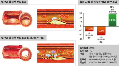 하지만 콜레스테롤이라 해서 무조건 나쁜 것만 있는 것은 아니다. HDL(High Density Lipoprotein : 고밀도 지방단백질)은 조직세포에 존재하는 과잉의 나쁜 콜레스테롤(LDL)을 제거하는 콜레스테롤로 막힌 혈관을 뚫어주어 원활한 혈액공급을 유지시키는 이로운 콜레스테롤이다.