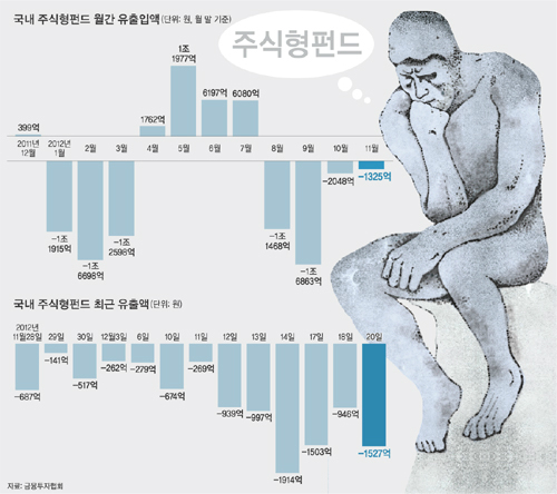 김순영 IBK투자증권 연구원은 “2008년 금융위기 이후 고점을 형성했을 때는 국내 주식형 펀드에서 하루 5000억∼6000억원이 썰물처럼 빠져나가기도 했다”면서 “지금 속도는 과거만큼 그리 빠르지 않지만 꾸준히 매물로 나온다는 점에서 증시의 발목을 잡는 요소”라고 말했다. 특히 미국의 재정절벽(재정적자를 줄이기 위해 정부 지출을 삭감하고 세금을 올림으로써 국민경제에 충격을 주는 현상) 협상이 타결돼 우리 증시가 상승세를 탈 경우 펀드 환매는 더욱 활발해질 것으로 보인다.