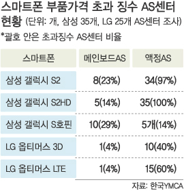 삼성 갤럭시S2HD의 경우 조사대상 35곳 모두가 제조사 책정가격보다 높았고, 삼성 갤럭시S2도 34곳이 더 높은 가격을 제시했다. LG와 팬택도 상당수 AS센터가 제조사 책정 가격보다 높았다.