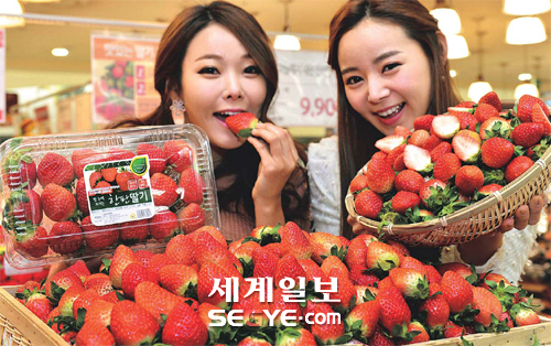 8일 롯데마트 서울역점에서 모델들이 경남 밀양·진주산 ‘한판 딸기’를 선보이고 있다. 롯데마트는 작년 9월 태풍 피해로 뒤늦게 출하시기를 맞은 경남 두 곳의 딸기 판매를 10일 시작한다.