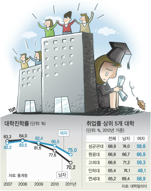 지난해 서울대 석사과정 입학생 중 여성이 1563명으로 남성 1400명을 처음 앞질렀지만 이 역시 평가가 긍정적이지만은 않다. 취업이 어려워지자 ‘울며 겨자 먹기’로 대학원 진학을 택하는 여학생이 많기 때문이다.