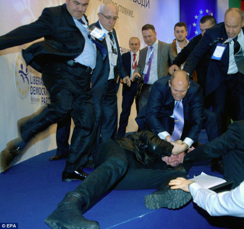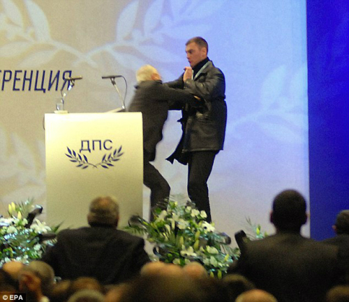 | 불가리아 수도 소피아에서 19일(현지시간) 열린 야당 전당대회에서 연설을 하는 아흐메드 도안 당수에게 한 괴한이 암살을 시도했으나 실패했다. <데일리메일 제공> |