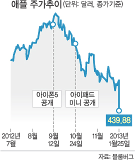 스마트폰 선두 주자인 삼성은 갤럭시S 등으로 지난해 4분기에 기록적인 76%의 판매 신장률을 기록했다. 그러나 애플의 아이폰5는 지난해 말 쇼핑 시즌이 포함된 시기에 판매 신장률이 정체됨에 따라 애플사에 대한 우려가 다시 살아나고 있고 이틀 사이에 애플사 주가는 14% 빠졌다. 또 애플사 주가는 지난해 9월19일 최고가를 기록했을 때와 비교하면 무려 37% 떨어졌다.