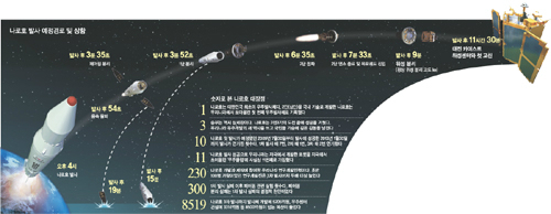 한국항공우주연구원에 따르면 나로호는 이륙한 지 54초 만에 음속을 돌파했고 215초 뒤에는 예정대로 위성덮개를 분리했다. 232초 뒤 1단 로켓이 떨어져 나간 데 이어 395초에는 2단 로켓 고체연료가 점화돼 그 추진력으로 목표궤도에 진입했다. 이어 노르웨이 트롬쇠 수신국은 오후 5시26분부터 10분간 나로과학위성이 보내오는 비콘(beacon) 전파 신호를 포착하는 데 성공했다.