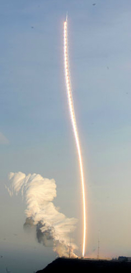 | 30일 전남 고흥 나로우주센터에서 발사된 우주발사체 나로호가 에스(S)자 궤적을 그리며 힘차게 발진하고 있다. 나로호는 1단 로켓에서 분출되는 고온·고압의 화염이 발사대 중요시설에 미칠 손상을 최소화하기 위해 발사 후 10초간 S자로 비행을 하는데 이를 ‘회피기동’이라 부른다. 고흥=사진공동취재단 |
