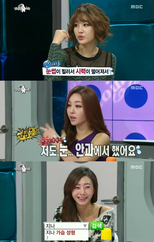 박은지, 지나, 강예빈은 지난 6일 방송된 MBC 예능프로그램 ‘황금어장-라디오스타’(이하 라디오스타)에 출연했다. 이날 박은지는 성형 수술에 대한 질문에 “속눈썹이 눈을 찔러 시력이 떨어졌다. 그래서 안과에서 쌍꺼풀 수술을 했다"고 고백했다.