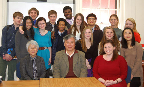 | 소설가 이문열(앞줄 가운데)씨가 미국 고교생들과 만나 토론한 뒤 기념촬영을 하고 있다. 시카고=연합뉴스 |