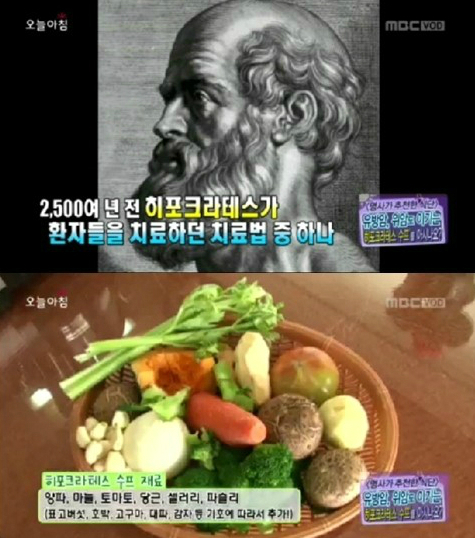 25일 오전 MBC에서 방송된 ‘생방송 오늘아침’에서는 ‘의학의 아버지’ 히포크라테스가 만들었던 수프가 공개됐다. 당시 히포크라테스는 암환자들의 해독을 위해 수프를 만들었다. 히포크라테스 수프는 기원전 550년경 발명됐으며, 1928년에 독일 의사 거슨 박사가 재발견해 만들었다.