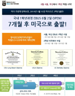 EBUS (Education Bound United States)는 미국 California 남부 3개 Community College의 협의체인 CCCD (Coastline Community College District)가 마련한 유학프로그램이며 CCCD는 UC Berkeley, UCLA, UC Irvine, CSU Long Beach등 명문대학과 편입 협정을 맺고 있다.