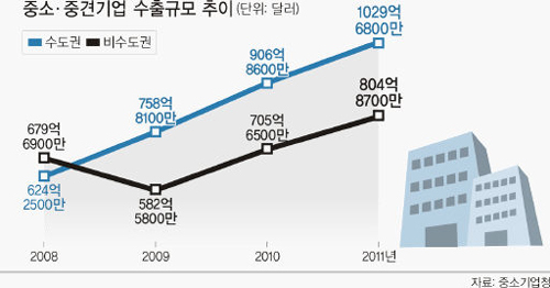 29일 중소기업청에 따르면 수도권과 비수도권 중소·중견기업 간 수출 격차는 갈수록 벌어지고 있다. 2008년만 해도 비수도권이 679억6900만달러로 수도권(624억2500만달러)을 앞섰지만, 2009년 들어 비수도권이 582억5800만달러로 퇴보한 사이 수도권은 758억8100만달러로 추월했다. 이후 격차는 2010년 201억2100만달러, 2011년 224억8100만달러로 더욱 벌어졌다. 한국 전체 수출에서 비수도권 중견·중소기업이 차지하는 비중도 2008년 16.1%에서 2011년 14.5%로 작아졌다. 이에 반해 수도권 기업은 같은 기간 14.8%에서 18.5%로 약진했다.