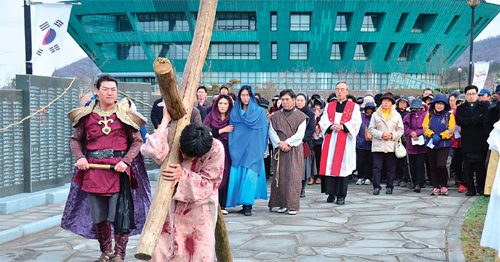 | 지난달 29일 제주도 제주시 4·3평화공원에서 천주교 제주교구 주관으로 십자가를 짊어진 예수 그리스도의 마지막 길을 재연하는 공연이 펼쳐졌다. 희고 붉은 사제 복장 차림으로 배우들의 뒤를 따르는 이가 제주교구장 강우일 주교다. 뒤로 보이는 건물은 4·3평화기념관. 한국천주교주교회의 제공 |