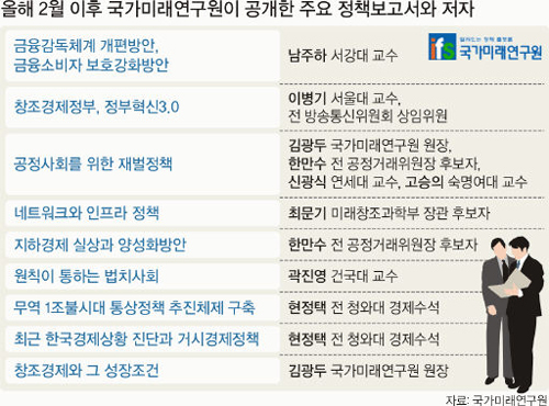 정부 인력·운영체제 공급처 역할 박근혜정부의 ‘싱크탱크’ 국가미래연구원이 현안이 생길 때마다 ‘근혜노믹스’의 좌표를 설정하고 있다. 보수가치의 구현자로서 그 존재감이 갈수록 뚜렷해지는 상황이다. 하지만 국가 거시정책에 입김을 불어넣는 개혁적 보수의 가치를 표방한 민간정책연구소의 등장을 바라보는 시각에는 기대와 우려가 교차한다.