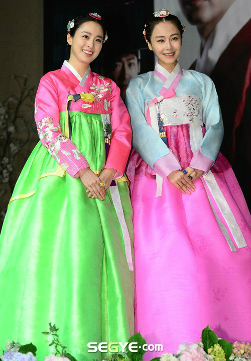 먼저 SBS 새 월화드라마 ‘장옥정, 사랑에 살다’에서 장희빈과 인형왕후로 맞대결을 펼치는 김태희와 홍수현은 한복 자태 경합을 벌였다. 지난 1일 경기도 일산 엠블호텔에서 열린 SBS 새 월화드라마 ‘장옥정, 사랑에 살다’ 제작발표회에 참석한 두 여배우는 사극 드라마의 주인공답게 화사한 한복 차림으로 등장해 취재진의 플래시 세례를 받았다.